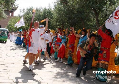 第201棒火炬手、德国汽车工程师罗曼在嘉峪关关城内传递。中新社发 周兆军 摄