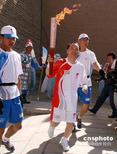 韩国籍第202棒火炬手李贤求在嘉峪关关城内进行传递。中新社发 周兆军 摄