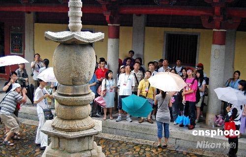 七月七日,参加海峡西岸二00八年台胞青年夏令营的一百一十多名台胞青年来到古城泉州,冒雨参观建于唐朝开元年间、迄今已有一千二百多年历史的开元寺。此次夏令营以“魅力海西、台胞祖地”为主题,旨在让两岸青年在参观历史文化古迹、聆听闽台传统文化讲座、举行联欢活动中增进友谊和对福建的了解。中新社发 傅丹丹 摄