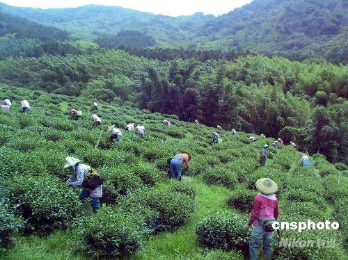 七月间正值台湾阿里山地区采茶季节,大清早开始工作的茶农在茶园采茶。中新社发 徐长安 摄