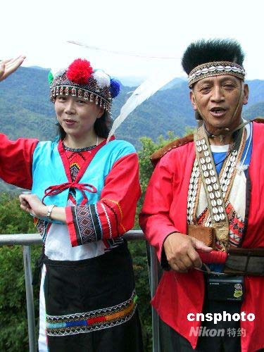 图中左为身着邹族传统服饰的大陆游客,右为当地邹族人士。中新社发 徐长安 摄