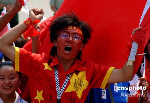 7月8日,奥运火炬在内蒙古呼和浩特传递,一名青年装束红火为奥运助威加油。 中新社发 廖攀 摄