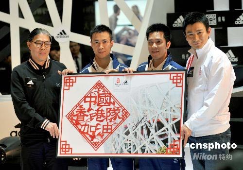 七月八日,香港体育协会暨奥委会会长霍震霆、香港“乒乓孖宝”李静、高礼泽及刘德华在香港时代广场出席adidas“专为北京打造”奥运产品展览开幕仪式,歌影红星刘德华致送一幅写上“中国、香港队加油”的剪纸予李静、高礼泽,以展示港人对中国及香港奥运代表队的支持。中新社发 邓庆乐 摄