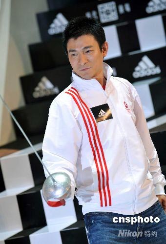 七月八日,北京奥运会合作伙伴adidas在香港举行“专为北京打造”奥运产品展览开幕仪式,歌影红星刘德华出席为活动宣传造势,并于活动上模仿击剑动作。 中新社发 邓庆乐 摄