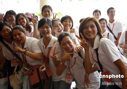 7月11日,台湾学生在上海兴高采烈地迎接夏令营开营。当日,“龙脉相传缘聚上海——台胞青年夏令营”在上海开营,来自台湾政治大学、成功大学、海洋大学、佛光人文学院的同学,以及在沪的台生、台籍青年等百余人参加。中新社发 潘索菲 摄