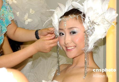 图为化装造型师为模特杨荻做新娘彩妆修饰。中新社发 张双双 摄