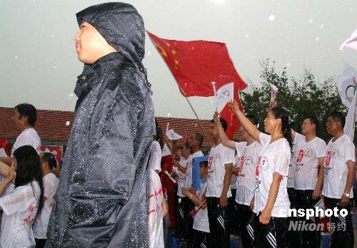 图:大庆石油工人冒雨为奥运火炬传递呐喊助威