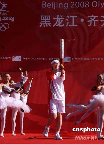 7月13日,北京奥运火炬在齐齐哈尔传递,第一棒火炬手是花样滑冰全国冠军刘艳。刘艳是中国在花样滑冰女子单人滑项目上最具实力的选手,被称为“女单一姐”。 中新社发 周兆军 摄