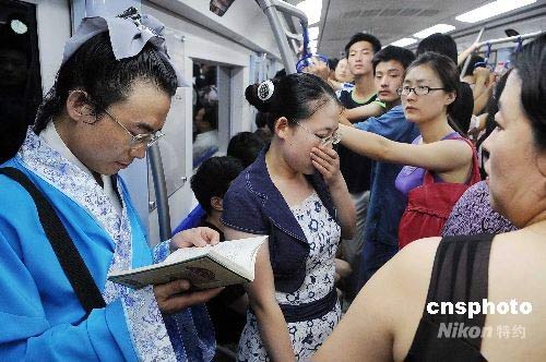 7月13日下午,一男子衣着汉服惊现北京地铁2号线,其扮像引来不少乘客目光。