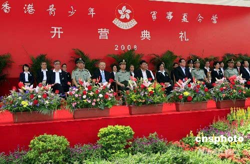 七月十四日,由中国人民解放军驻港部队、军民同乐活动筹委会、德育关注组及香港特别行政区教育局合办的第四届“香港青少年军事夏令营”开营典礼在新界粉岭“新围军营”举行,香港青少年军事夏令营发起人董赵洪娉、中联办主任高祀仁、外交部驻港特派员吕新华、驻港部队司令员张仕波少将、政委刘良凯少将、行政长官夫人曾鲍笑薇等主持开营典礼。中新社发 张勤 摄