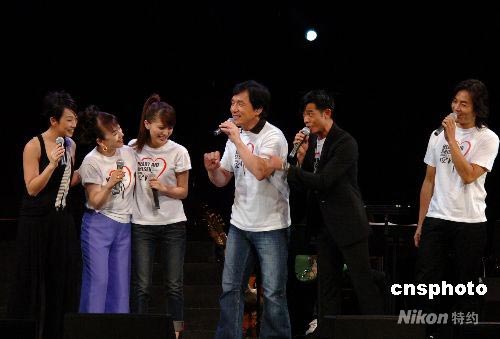 7月14日晚,由翁倩玉、成龙发起,郭富城、郑伊健、林忆莲、W-inds、东仪秀树、JULY、John-Hoon等中日韩三国十多位著名歌手与音乐家参加的大型义演“HEART AID 四川”在日本东京举行。众明星表示,愿四川地震灾区的人们早日战胜困难,重建美好家园。图为林忆莲、翁倩玉、ALAN、成龙、郭富城、郑伊健(从左自右)在演唱会上共歌一曲《明明白白我的心》。中新社发 朱沿华 摄