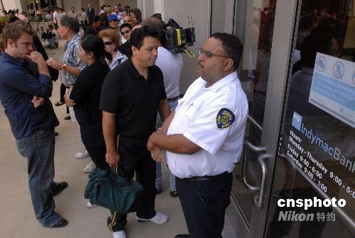 当地时间7月14日上午,数百名储户在加州帕萨迪纳市的“因迪美联邦银行”门口排队等待提取现金。 受次贷危机影响,6月底以来,美国最大的抵押贷款商因迪美银行(IndyMac Bank)遭客户挤兑,在11天内被客户提走现金13亿美元,本月11日,因流动性严重不足,该银行被美国储蓄管理局勒令关闭,并将其业务转交至联邦存款保险公司运营,该银行成为美国次贷危机以来被关闭的最大抵押贷款商。被接管并更名后的“因迪美联邦银行”14日开始营业,大批客户仍担心财产受损,一大早便排队等待提现。中新社发 张炜 摄