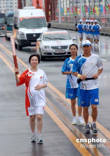 7月15日下午,奥运火炬在吉林市传递,已经怀孕7个月的火炬手李圆传递火炬。 中新社发 廖攀 摄