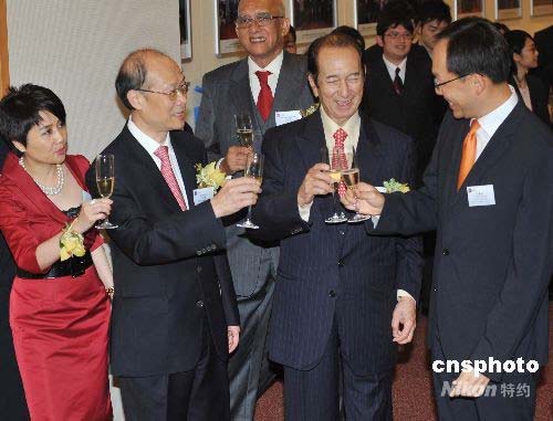 七月十六日,澳门博彩控股有限公司在香港港交所挂牌上市,澳博主席及执行董事何鸿燊、澳博行政总裁苏树辉(左二)与香港上市委员会委员吴继龙(右)等为澳博上市举杯庆贺。中新社发 邓庆乐 摄