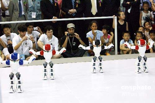 7月16日,2008机器人世界杯赛在苏州国际博览中心举行,约有来自30个国家的300多支队伍的1400多名参赛者及学者参加此次比赛和学术研讨会。据悉,本届机器人世界杯赛是首次在中国举办,同时也开创了在发展中国家举办机器人世界杯赛的先河。中新社发 徐志强 摄