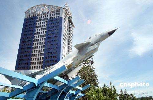 2008年7月17日,歼十飞机景观工程在中国航空工业第一集团公司总部前“一航花园”隆重揭幕。这标志着歼十飞机景观工程正式落户朝阳CBD。这架歼十是完全根据真机的一比一高仿模型,机上细节分毫毕现。歼十作出大仰角爬升的姿态,翼下挂有国产雷石6滑翔制导炸弹、霹雳9C近距格斗空空导弹及霹雳12中距空空导弹。中新社发 博芽影像 摄