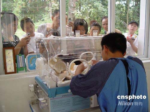 图为游客透过窗户观看人工饲养熊猫幼仔。7月6日早晨7点52分和8点36分,卧龙大熊猫“帼帼”在发情配种119天后,顺利产下一对双胞胎,这是5.12汶川大地震后在中国保护大熊猫研究中心雅安碧峰峡基地出生的第一对双胞胎,也是全世界今年出生最早的大熊猫宝宝。地震时,“帼帼”的圈舍严重被毁,她受到严重惊吓,逃逸出圈外,后研究中心工作人员将其找回。中新社发 罗小韵 摄