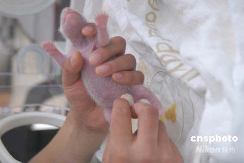 中国保护大熊猫研究中心雅安碧峰峡基地工作人员给熊猫幼仔人工排便。中新社发 罗小韵 摄