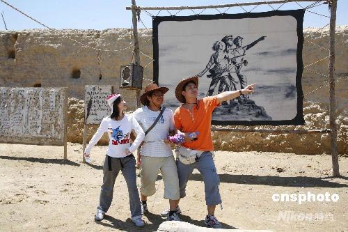 台湾学生参观著名的“镇北堡西部影城”,图为部分台湾学生模仿在大陆家喻户晓的长春电影制片厂“工农兵”片头之景。中新社发 潘索菲 摄