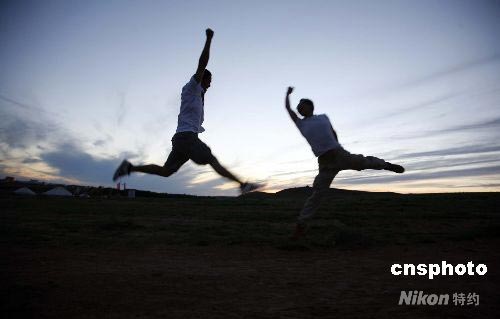 7月17日晚,为期5天的台湾学生宁夏、内蒙“中华文化寻根夏令营”圆满结束,上海中医药大学的35位台湾学生返沪。图为台湾学生首次欣赏到内蒙古希拉穆仁草原美景,纷纷叫爽雀跃。中新社发 潘索菲 摄