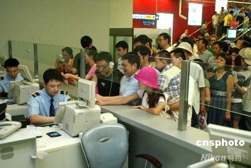 7月19日,北京地铁10号线(一期)、奥运支线、机场线开通试运营。下午14时,机场线正式向民众开放,很多民众在东直门站争相购买车票,试乘机场线。中新社发 富田 摄