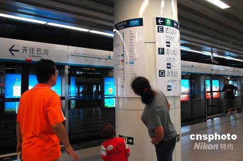 7月19日,北京轨道交通机场线、地铁10号线(一期)、奥运支线等三条线路试运营开通。地铁10号线是连接北京东部和北部的一条重要轨道线路,一期全长25公里。图为在地铁10号线芍药居车站中,乘客观察站牌。中新社发 张双双 摄