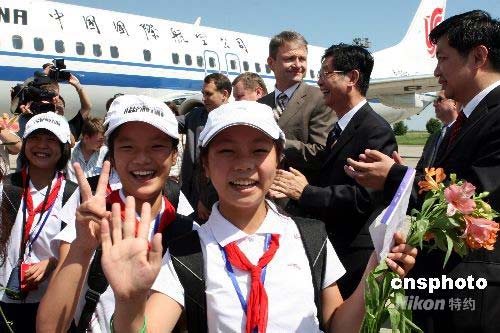 7月19日,184名来自四川地震灾区的中小学生在老师、医生和翻译的陪同下,乘包机抵达俄罗斯克拉斯诺达尔边疆区,开始为期三周的疗养。中国驻俄罗斯大使刘古昌、俄罗斯总统驻南方联邦区代表乌斯基诺夫、克拉斯诺达尔边疆区行政长官特卡乔夫等专程前往机场迎接。中新社发 田冰 摄