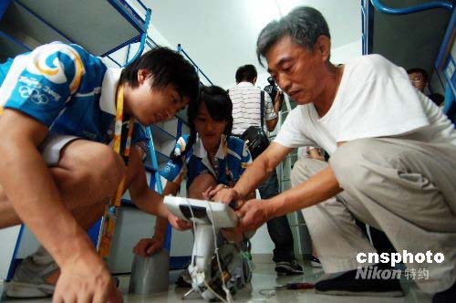 志愿者和工作人员正在北京2008奥林匹克青年营宿舍安装风扇。中新社发 王东明 摄