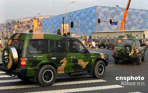 图:大批军车进驻北京奥运会主场馆区域