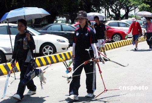 图为中午,射箭运动员们正结束训练,返回休息。中新社发 黄少华 摄