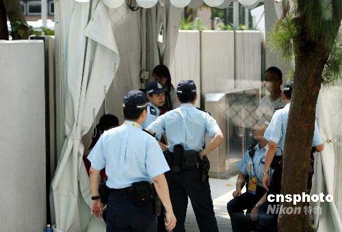 七月二十六日,参加奥运马术比赛的首批马匹运抵香港沙田赛场,警方高度重视保安情况,沙田赛场各入口处戒备森严。当日,奥运马术公司强调,将跟香港警方、国际奥委会和北京奥组委等保持密切联系;若警方提升风险评估级别,马术公司也会作出相应调整和配合。中新社发 洪少葵 摄
