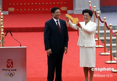 7月27日,北京奥运村开村。北京市委书记、北京奥组委执行主席刘淇向奥运村村长、北京奥组委副主席陈至立移交奥运村钥匙。中新社发 杜洋 摄