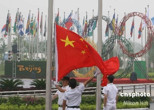 7月27日,北京奥运会的运动员之家——奥运村正式开村,来自205个国家和地区的16000名运动员和随队官员将逐步入住。图为中国代表团升旗仪式。中新社发 武仲林 摄