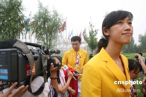7月27日,北京奥运会的运动员之家——奥运村正式开村,来自205个国家和地区的16000名运动员和随队官员将逐步入住。图为王致郅接受记者采访。中新社发 武仲林 摄