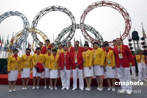 7月27日,北京奥运村正式开村。中国代表团部分运动员(举重、摔跤、柔道)在奥运村合影。中新社发 杜洋 摄