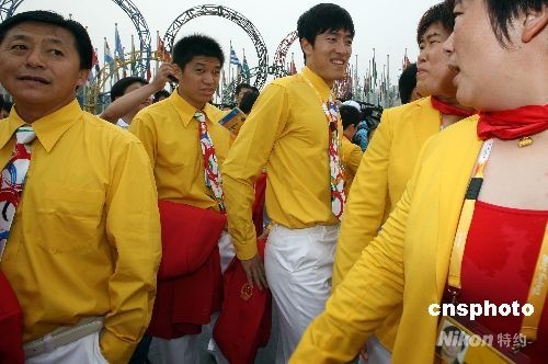 7月27日上午,北京奥运会运动员村正式开村,率先入驻的中国体育代表团举行隆重的升旗仪式。为了“躲避”众多志愿者、工作人员的拍摄与签名,大明星刘翔只好隐身在田径队的队友中。中新社发 任晨鸣 摄