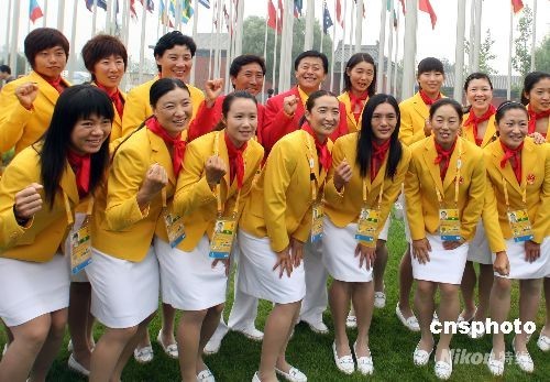 7月27日上午,北京奥运会运动员村正式开村,率先入驻的中国体育代表团举行隆重的升旗仪式。由韩国教练金昶伯(后排左四)指教的中国女子曲棍球队发誓要汲取雅典奥运会的教训,向奖牌冲击。中新社发 任晨鸣 摄