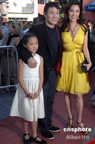 环球影业七月二十七日在好莱坞举行《木乃伊3:龙帝之墓》(The Mummy: Tomb Of The Dragon Emporer)首映式。著名功夫影星李连杰和杨紫琼及李连杰爱女Jane出席首映式。中新社发 张炜 摄