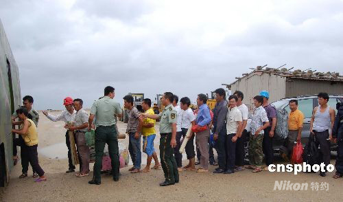 图为边防官兵冒着风雨用车辆将在福州新港国际码头施工的一百六十余位工人迅速转移至安全地带。中新社发 朱明海 摄