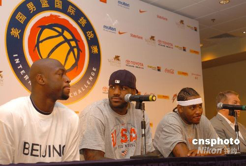 图为七月二十八日抵达澳门的美国球员德怀恩·韦德(左一)、勒布朗·詹姆斯(左二)及卡梅隆·安东尼出席记者会。美国国家男篮队将于七月三十一日及八月一日在澳门与土耳其及立陶宛队进行两场奥运热身赛。中新社发 毕永光 摄
