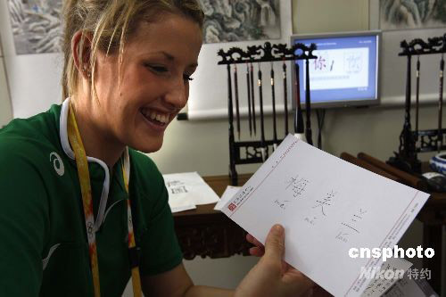 7月29日,来自爱尔兰的女选手在北京奥运村中文服务中心,请人帮助自己起了一个好听的中文名字“梅美兰”非常开心。 中新社发 杜洋 摄