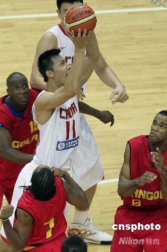 7月29日晚,国际篮联2008钻石杯男篮比赛中国队与安哥拉队的比赛在江苏南京奥体中心体育馆举行。最终中国队83比74战胜安哥拉队,取得开门红并报了斯坦科维奇杯输球的一箭之仇。参加钻石杯男篮比赛的队伍包括阿根廷队、澳大利亚队、塞尔维亚队、安哥拉队、伊朗队和东道主中国队。这次比赛也是北京奥运会前各队的最后一次热身机会。图为中国队11号队员易建联进攻。 中新社发 盛佳鹏 摄