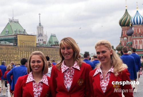 7月29日,俄罗斯总统梅德韦杰夫在克里姆林宫为参加北京奥运会的俄罗斯代表团举行送行仪式,鼓励本国运动员争创佳绩。俄罗斯奥运代表团将于近日陆续抵达北京。图为身穿奥运礼服的俄罗斯女运动员在红场留影。 中新社发 田冰 摄