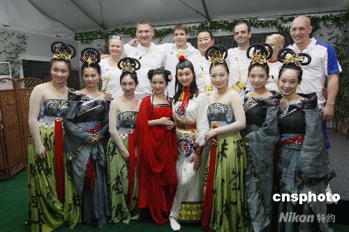 图为英国跳水队和奥运村茶馆里的演员一起合影。 中新社发 杜洋 摄