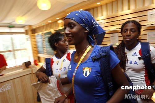 7月29日,来自古巴的女运动员在北京奥运村的纪念章交换中心参观。中新社发 杜洋 摄