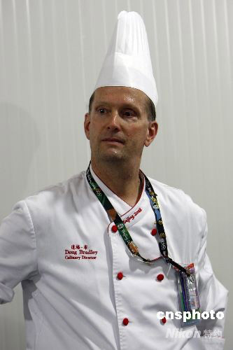 图:奥运村餐厅身挂多届奥运纪念章的外籍大厨