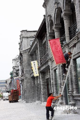 7月30日,北京前门大街几名工作人员正在张挂牌匾布幌。中新社发 郑雄增 摄