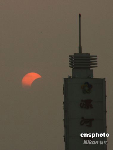 8月1日18点30,河南漯河市开始出现日食,许多天文爱好者聚集到广场欣赏日食,虽然没能看到食甚,但却看到“带食而落”天文奇观。中新社发 李慧宇 摄