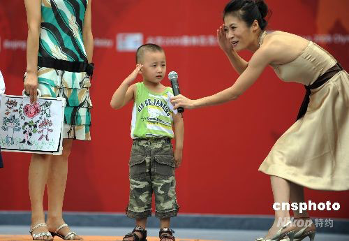 8月5日,在奥运火炬成都传递结束仪式上,四川地震时曾向解放军敬军礼的“敬礼娃娃”郎铮向奥运火炬敬礼。中新社发 廖攀 摄