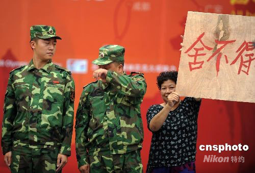 8月5日,奥运火炬在四川成都传递,在传递结束仪式上四川民众为抗震官兵举起“舍不得你们走”的标语,抗震官兵感动抹泪。 中新社发 廖攀 摄